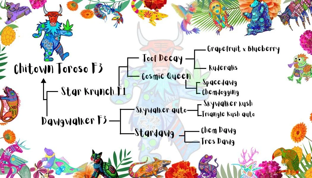 The (Star Krunch x Dawgwalker) F1’s were the very first freebie included in our first drop (Tangy Tibuguana) back in September of 2022. I received such great feedback about the quality from various testers that I decided it was a cultivar worth working forward to a more stable population. In early 2023 I crossed matching phenotypes of the F1’s out of a selection of 6 plants, that had a nice bushy structure and spicy cheese and fruity aromas. I popped 12 of the F2’s in summer of 2024 for a small hunt. The 3 I sprayed for the reversal selection all had the nice bushy structure I was after. The final mother selection also had the bushy structure and incredibly strong and complex aroma profile dominated by gas. The F3’s from this mother have all been pretty consistent with her traits.